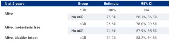 在保膀胱治疗方面,HCRN GU 16-257研究是一项多中心2期试验,入组了76例cT2-T4aN0M0的尿路上皮膀胱癌患者,在接受4个周期的吉西他滨、顺铂联合纳武利尤治疗后,根据尿液细胞学、膀胱MRI/CT、膀胱镜检查和膀胱活检进行临床再分期,达到cCR(细胞学、影像学正常,cT0/Ta)的患者则不进行膀胱切除术,并接受8个周期的纳武利尤单抗(q2wk)治疗和监测;没有达到cCR的患者建议行膀胱切除术。研究的主要终点是cCR率和2年生存结局。此次报道的数据中,有72/76例进行临床再分期,33/76例(43%)患者获得cCR,其中1例患者即刻行膀胱切除术(ypTaN0M0),cCR和非cCR患者的2年生存率分别为100%和75.8%。该研究表明NIVO联合GC的术前治疗方案,可获得较高的cCR率并实现保膀胱,而且达到cCR的患者均可实现2年生存。