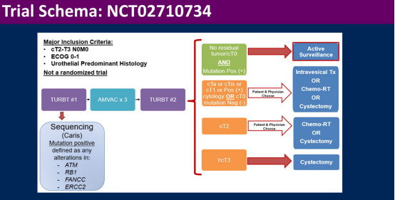 在尿路上皮癌的全体大会上,Fox Chase癌症中心的Geynisman教授则提出了在临床分期基础上联合生物标志物,用于指导新辅助化疗的后续治疗。在他报告的一项单臂、2期RETAIN研究中,入组71例分期为cT2-T3N0M0并完成MVAC新辅助化疗的UC患者,对于TURBt、尿细胞学、影像学临床无疾病证据(NED)的患者,如果新辅助化疗前的TURBt标本检测存在≥1种突变(ATM、ERCC2、FANCC、RB1等),则接受主动监测(AS)。研究结果显示,ITT人群的2年MFS率为72%(单侧95%CI下限=62%),遗憾的是没有达到非劣效性(研究预设的单侧95%CI下限的非劣效界值为>64%);AS患者和其他患者的2年MFS率也没有显著差异(65%vs 76%;P=0.42);尽管有50%的AS患者可避免膀胱切除,但仍有38%的患者出现疾病转移,这种基于生物标志的新辅助后AS策略仍有待完善。