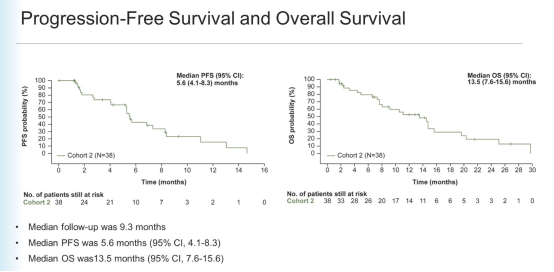 TROPHY-U-01研究(NCT03547973)是一项多队列、开放标签的2期临床试验,基于队列1的积极结果,FDA已加速批准Trop-2 ADC戈沙妥珠单抗(SG)用于经过铂类化疗和免疫治疗的晚期UC患者。此次ASCO-GU大会上该研究的多个队列有更新或首次披露。队列1的更新结果与以往大致相似,SG单药治疗的ORR为28%,CBR为38%,中位PFS和OS分别为5.4个月和10.9个月。队列2是针对铂类不耐受且经过免疫治疗失败的患者(既往中位治疗线数为2),SG单药治疗的ORR为32%,中位PFS和OS分别为5.6个月和13.5个月(下图)。队列3是针对经过铂类治疗失败的患者,SG+帕博利珠单抗联合治疗的ORR为41%,中位PFS和OS分别为5.3个月和12.7个月。此外,队列6(SG单药或联合免疫用于铂类不耐受的一线治疗)、队列5(SG单药或联合免疫用于铂类不耐受的一线维持治疗)正在进行中。