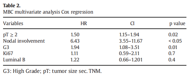 研究结果:MBC占非转移性乳腺癌的6.7%。平均随访时间为5.5年。男性患乳腺癌的年龄比女性大。大多数MBC患者有淋巴结受累,并接受了他莫昔芬辅助内分泌治疗,但由于副作用而退出的比例较高(17.3%vs 7.6%,P=0.04)。组织学特征见表1。在诊断时,MBC相较于女性乳腺癌的肿瘤体积更小(17.3mm vs 21.5mm,P<0.05)。男性和女性在DFS和OS方面没有差异,10年复发率相似(12%vs 12.4%)。在两组中,N+、高分级(G3)和肿瘤大小≥20毫米与较差的DFS显著相关(P<0.05)。多因素Cox回归分析显示,pT≥2(HR 1.5,95%CI:1.15~1.94)、N+(HR 6.43,95%CI:3.55~1.67)和G3(HR 1.94,95%CI:1.08~3.51)是MBC较差预后的独立预测因素(表2)。采用PSM匹配后,两组的OS没有差异(P=0.09)。