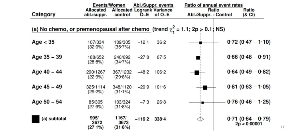 该荟萃分析提示,对于绝经前ER阳性女性乳腺癌患者,卵巢切除/抑制可显著降低乳腺癌15年复发风险和20年死亡的风险,较未切除/抑制患者取得更多获益;且无论患者年龄分层如何、淋巴结状态如何,亦能通过卵巢切除/抑制取得生存获益1