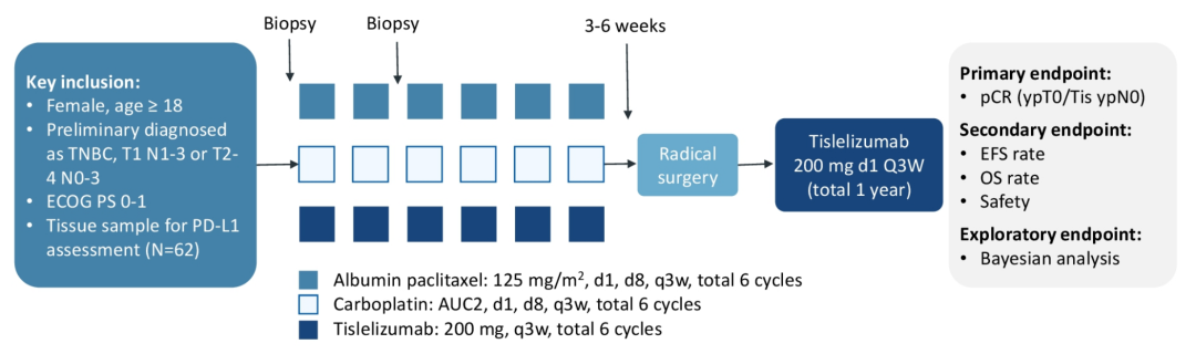 方法:这是一项多中心、开放标签的Ⅱ期研究,入组患者为未经治疗、组织学确诊的Ⅱ-Ⅲ期TNBC患者(AJCC第8版),包括T1 N1-3或T2-4 N0-3。患者接受6个周期的新辅助治疗,即替雷利珠单抗(200mg)联合白蛋白紫杉醇(125 mg/m2,第1天和第8天)和卡铂(AUC 2,第1天和第8天),均为每3周1次。新辅助治疗后接受手术,术后继续接受12个周期的替雷利珠单抗辅助治疗。研究的主要终点是pCR率(ypT0/Tis ypN0)。次要终点包括1年、2年、3年无事件生存(EFS)率和总生存(OS)率。研究采用Simon两阶段设计,第一阶段有13/32例患者达到pCR,则第二阶段扩大招募62例患者;第二阶段有29/62例患者实现pCR,则研究达到主要终点。