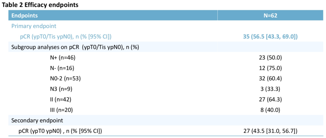 截至2023年5月6日,62例可评估患者中,有35例获得pCR(ypT0/Tis ypN0),pCR率为56.5%(95%CI:43.3~69.0),研究达到了主要终点。亚组患者的pCR如下表所示,总体上N-组(75%)相较于N+组(50%)、Ⅱ期患者(64.3%)相较于Ⅲ期患者(40%)pCR率更高,且有43.5%(27/62)的患者达到了pCR(ypT0 ypN0)。