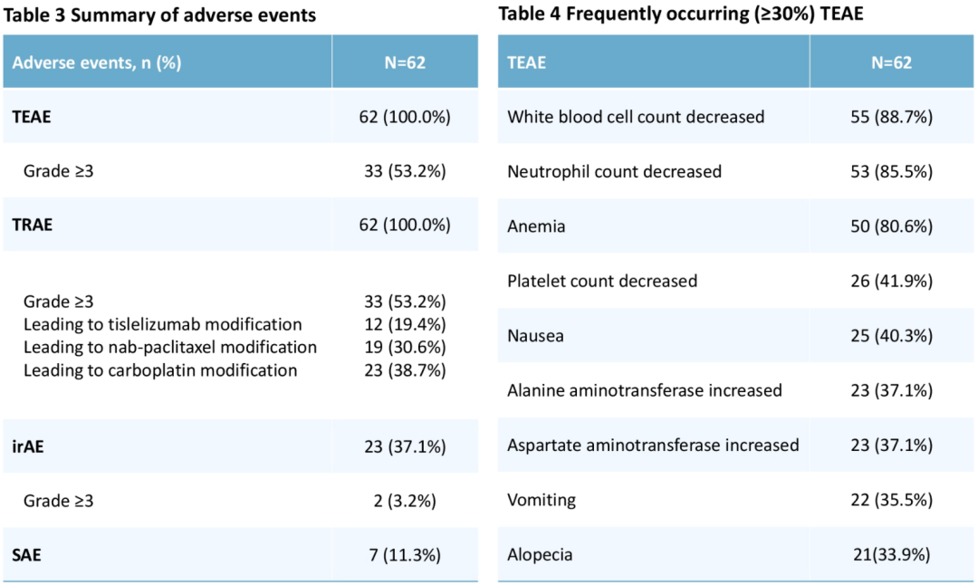 所有62例(100%)患者报告了任何级别的治疗相关不良事件(TRAEs)。33例(53.2%)患者发生≥3级TRAEs,导致替雷利珠单抗、白蛋白紫杉醇或卡铂调整剂量的比例分别为19.4%、30.6%和38.7%。23例(37.1%)患者发生免疫相关不良事件(irAE),其中2例(3.2%)为≥3级irAE。7例(11.3%)发生严重不良事件(SAE)。常见的治疗期间不良事件(TEAEs)为白细胞计数减少(88.7%)、中性粒细胞减少症(85.5%)、贫血(80.6%)、血小板计数减少(41.9%)、恶心(40.3%)等。