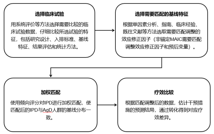 与未调整间接比较相比,MAIC减少了混杂因素的影响。高质量MAIC能有效利用现有数据和已发表的临床研究证据为研究者提供关键的数据与证据支持。对于个体病例数据,需要注意缺失数据,选择适当的方法处理缺失值,如多重插补法。当事件较少,数据的信息量较小时,敏感性分析可以帮助确定研究结果的稳健性。