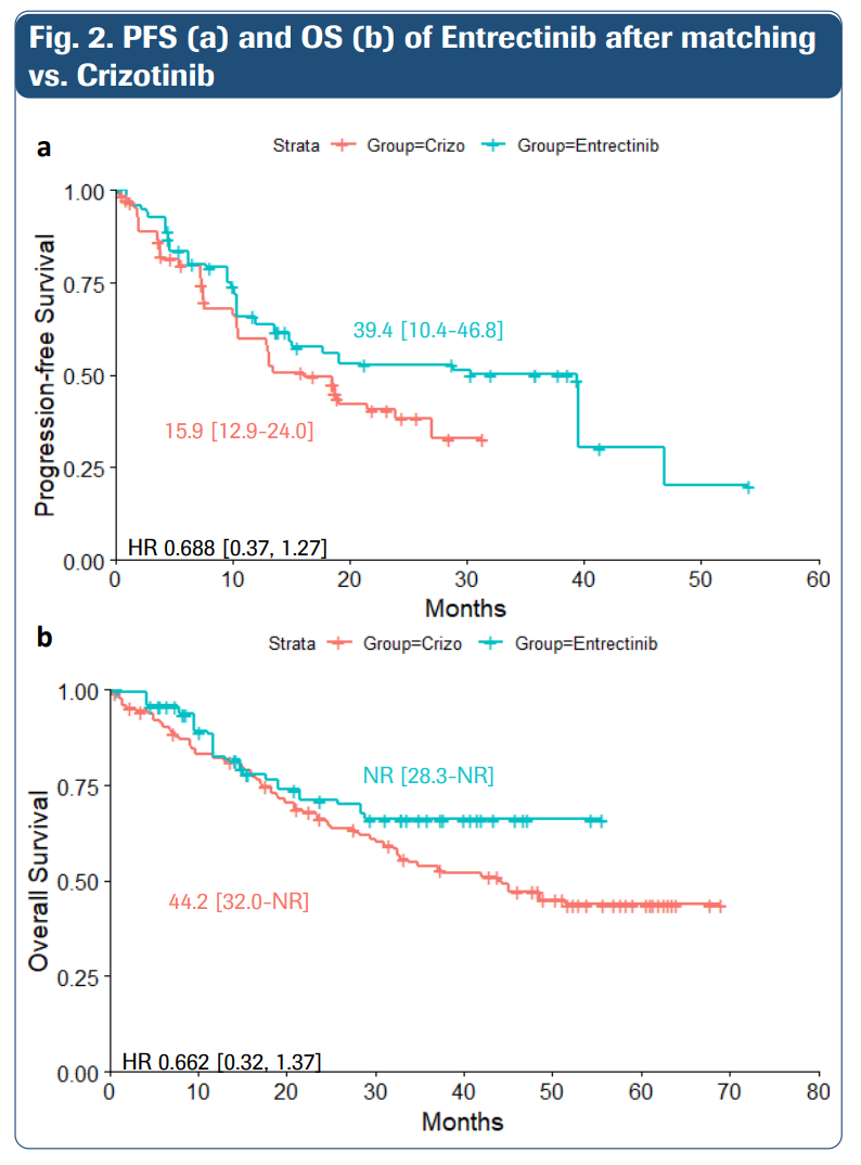 研究结果如下图所示,恩曲替尼组患者(匹配后)的中位PFS达39.4个月,优于克唑替尼组的15.9个月。同时,匹配后,与克唑替尼相比,恩曲替尼可降低31.2%的疾病进展风险(HR=0.688)和33.2%的死亡风险(HR=0.668)。对于亚洲ROS1融合阳性NSCLC患者,与克唑替尼相比,恩曲替尼显示出更好的生存结局趋势,支持其在临床实践中的使用。