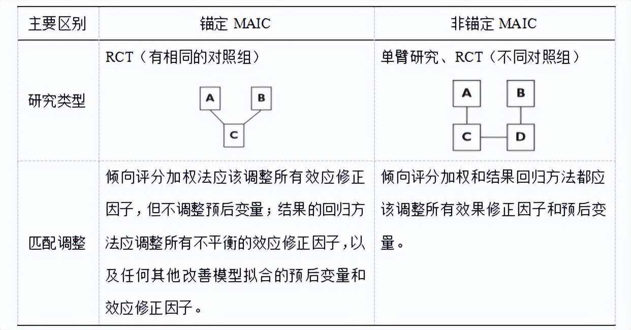 根据两种干预措施是否有共同对照组,可分为锚定MAIC和非锚定MAIC。锚定MAIC和非锚定MAIC的主要区别在于研究类型和间接比较方法,具体见表1。