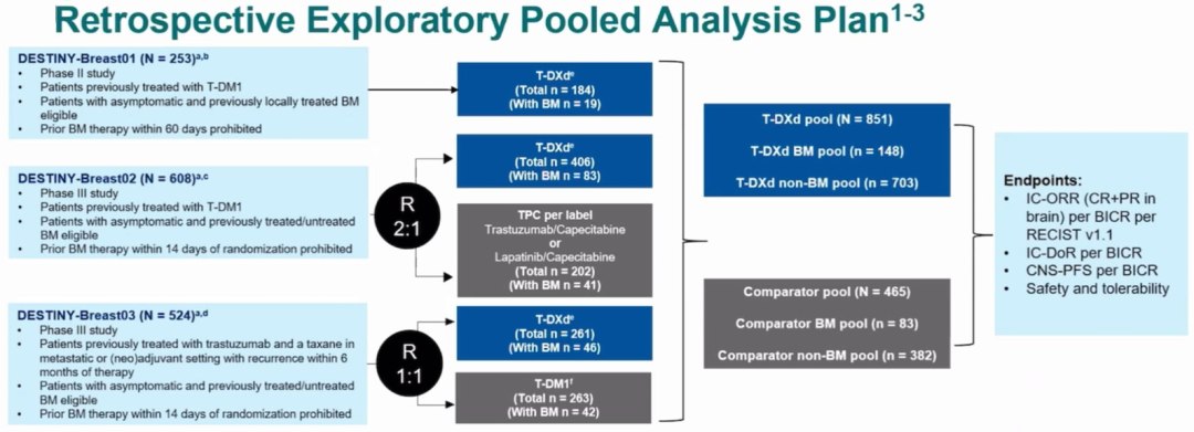 DESTINY-Breast03(DB-03)是T-DXd的首个III期临床试验,研究结果证实T-DXd可显著改善HER2+转移性乳腺癌二线治疗结局。但由于临床试验中HER2+脑转移患者的入组存在诸多限制条件,因而T-DXd对该部分患者的疗效尚未明确。这项探索性研究汇总分析了DB-01、DB-02和DB-03临床试验的HER2+脑转移患者,以进一步分析T-DXd治疗HER2+脑转移患者的疗效和安全性。
