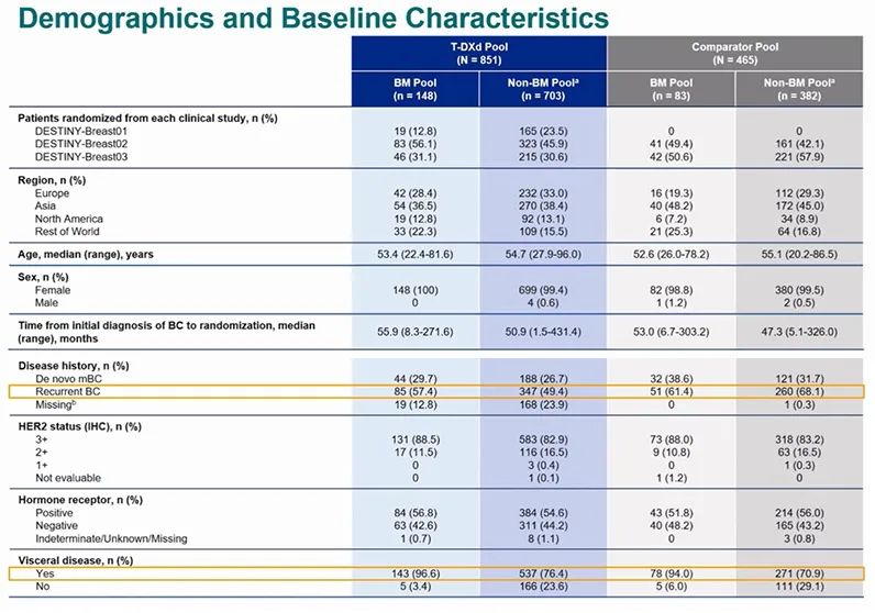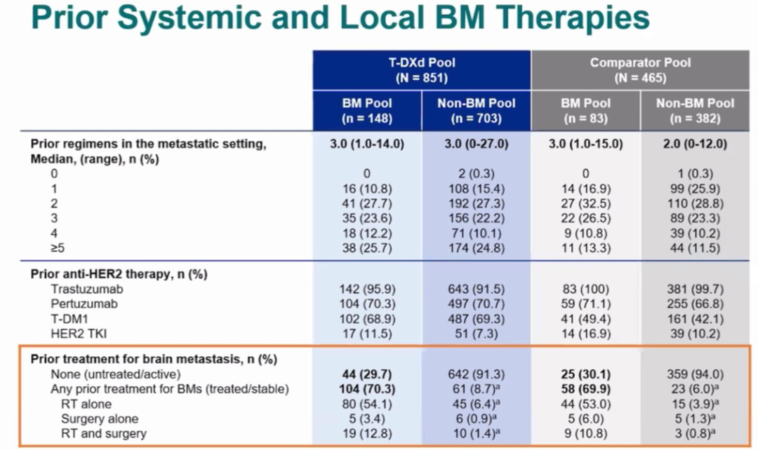 脑转移既往经治的中位治疗线数为3(1.0-14.0)。T-DXd治疗组和对照组中的基线存在脑转移患者分布也一致,均约70%为稳定性脑转移患者,约30%为活动性脑转移患者。