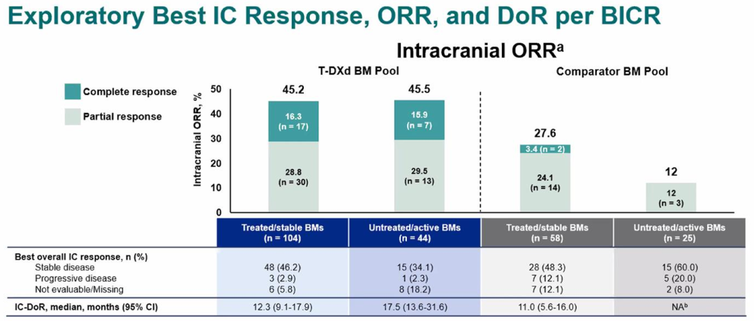 根据美国FDA临床试验标准的定义,脑转移可分为两类[2]:经治/稳定性脑转移,即既往接受过针对脑转移的中枢神经系统(CNS)定向治疗,并且CNS稳定;未经治/活动性脑转移,即患者存在新发脑转移或进展性脑转移,自进展以来尚未接受针对CNS的定向治疗。本次分析纳入了DB-01、DB-02中既往接受T-DM1治疗的患者;DB-03中纳入接受过曲妥珠单抗和紫杉类治疗的患者。T-DXd探索性颅内分析数据来自DB-01、DB-02和DB-03三项研究。对照组TPC和T-DM1数据分别来自DB-02和DB-03。终点为根据RECIST进行盲法独立中心评价(BICR)的IC-ORR(包括CR和PR)、颅内缓解持续时间(IC-DoR)、CNS-PFS和安全性。