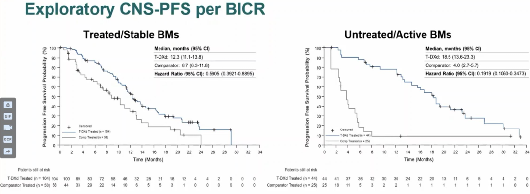 在T-DXd治疗的148例基线存在脑转移患者中,其中104例(70.3%)既往接受过治疗,44例(29.7%)未经治疗。在所有脑转移患者中,T-DXd治疗组的颅内客观缓解率优于对照组(稳定性脑转移患者:45.2%vs.27.6%;活动性脑转移患者:45.5%vs.12.0%)。T-DXd可延长稳定性脑转移患者的IC-DoR(12.3个月vs.11.0个月)和CNS-PFS(12.3个月vs.8.7个月,HR=0.59);然而T-DXd治疗活动性脑转移患者的中位IC-DoR延长趋势最为明显(17.5个月vs.NA),并且还具有延长CNS-PFS的明显优势(18.5个月vs.4.0个月,HR=0.19)。