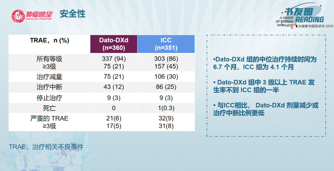 Dato-DXd组的中位治疗持续时间为6.7个月,ICC组为4.1个月,安全性方面,Dato-DXd组中患者≥3级TRAE发生率不到ICC组的一半,与ICC相比,Dato-DXd剂量减少或治疗中断比例更低。