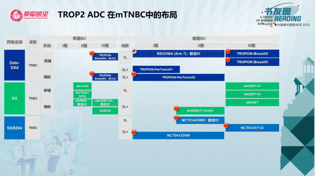 SG(Sacituzumab Govitecan)是一种靶向Trop-2的ADC,关键性Ⅲ期ASCENT研究数据显示,既往接受过二线以上标准化疗的mTNBC患者,SG相比医生选择的单药化疗(TPC)显著改善患者的PFS和OS。DS-1062、SKB264等其他在研的靶向Trop-2 ADC疗效也同样值得期待。