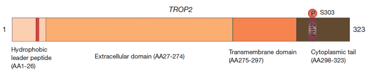 TROP2蛋白由疏水前导肽(AA1–26)、胞外结构域(ECD) (AA27–274)、跨膜结构域(AA275–297)和胞质尾部(AA298–323)组成,包含323个氨基酸(图1)。TROP2是一种Ⅰ型跨膜细胞表面糖蛋白,通过单向跨膜螺旋 (TM) 将 N 端胞外域 (EC) 连接到 IC 疏水性多肽短尾,从而将其固定在细胞膜上。胞质尾部存在高度保守的磷脂酰肌醇4,5-二磷酸(PIP2)结合序列以及酪氨酸和丝氨酸磷酸化位点,表明PIP2对TROP2的信号转导具有重要影响。