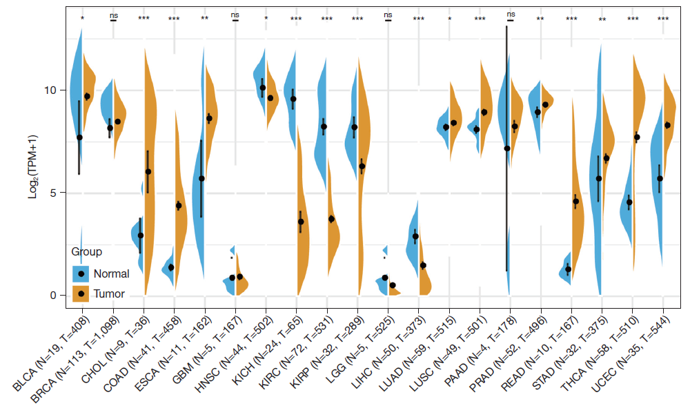 BLCA:膀胱尿路上皮癌;BRCA:乳腺癌;CHOL:胆管癌;COAD:结肠腺癌;ESCA: 食管癌;GBM:胶质母细胞瘤;HNSC:头颈鳞癌;KICH:肾嫌?细胞癌;KIRC:肾透明细胞癌;KIRP:肾乳头状细胞癌;LGG: 低级胶质瘤;LIHC:肝细胞癌;LUAD:肺腺癌;LUSC:肺鳞癌;PAAD:胰腺癌;PRAD:前列腺癌;READ:直肠腺癌;STAD:胃腺癌;THCA:甲状腺癌;UCEC:子宫内膜癌