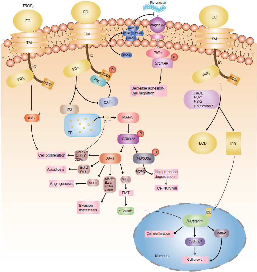 TROP2 作为细胞膜表面的新型糖蛋白受体,主要通过调节钙离子信号通路和细胞周期蛋白表达以及减少纤连蛋白粘附来促进肿瘤细胞的生长、增殖和转移。TROP2胞质尾部的丝氨酸残基(S303)一旦被PKC磷酸化,PIP2就会进一步水解成三磷酸肌醇(IP3)和二酰甘油(DAG)。IP3从内质网释放Ca2+,刺激MAPK信号转导和细胞周期进程。游离Ca2+和DAG的增加可以通过正反馈机制激活更多的PKC。PKC的增加可能导致TROP2的进一步磷酸化。