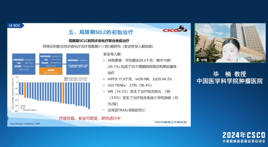 毕楠教授的精彩解读,领域内专家反响热烈。在讨论环节中,中国医学科学院肿瘤医院山西医院的曹建忠教授和山东省肿瘤医院的朱慧教授,均对放疗在SCLC治疗中的关键地位表示了高度认可,并深入探讨了放疗在SCLC治疗中的未来应用前景及在免疫治疗领域中的探索方向。上海市胸科医院的蔡旭伟教授和河南省肿瘤医院的葛红教授,则聚焦于我国自主研发的免疫检查点抑制剂,特别是以阿得贝利单抗为代表的研究成果,强调了这些创新药物在免疫治疗时代背景下对我国临床治疗的指导意义,并盛赞这些新药为SCLC患者提供了更为先进、有效且可及的治疗选择。