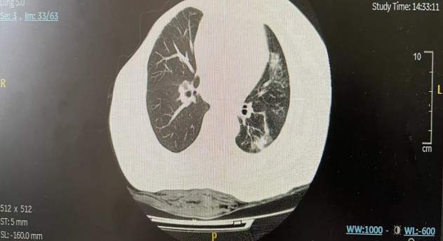二线治疗前(2022年7月)患者再次出现高热,于外院诊断肺炎(图2)。抗炎治疗3周后,肺炎有所好转(图3),体温恢复。