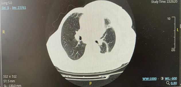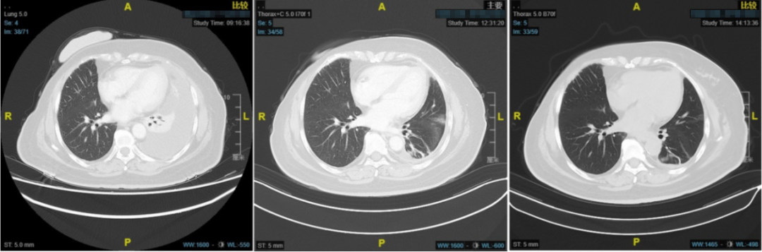图3.抗炎治疗3周后胸部CT示左肺炎好转