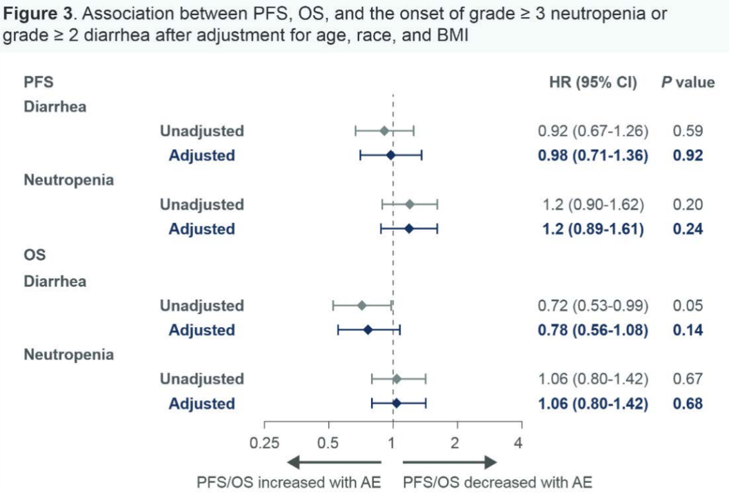 图7.ASCENT事后分析:腹泻和中性粒细胞对PFS和OS均无影响