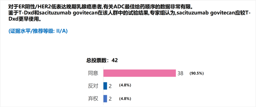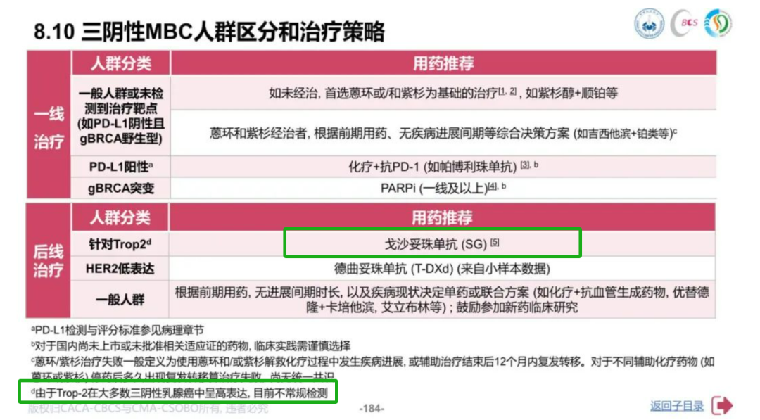 在一系列循证医学证据的推动下,美国食品药品监督管理局(FDA)和中国国家药品监督管理局(NMPA)已陆续批准SG用于二线及以上治疗mTNBC[7-8]。这些研究公布后,ABC7晚期乳腺癌专家共识投票中,有90.5%(38/42)的专家赞成SG应该早于T-DXd使用(图8);而NCCN指南则将SG推荐作为晚期TNBC二线治疗的1类优选方案,而且不受HER2表达状态的限制(图9)[9]。在国内,最新版的2024年CBCS指南推荐戈沙妥珠单抗作为TNBC后线治疗选择,且不需常规检测TROP-2(图10)[10];2024版的CSCO指南则将戈沙妥珠单抗作为晚期TNBC解救治疗唯一推荐的新型ADC(图11)[11]。这些指南共识的更新,再次印证了本例患者在此前的治疗选择是合理的,戈沙妥珠单抗可作为晚期TNBC二线治疗的优选。我们也期待有更多的证据能够为新型ADC序贯治疗带来更多指导。