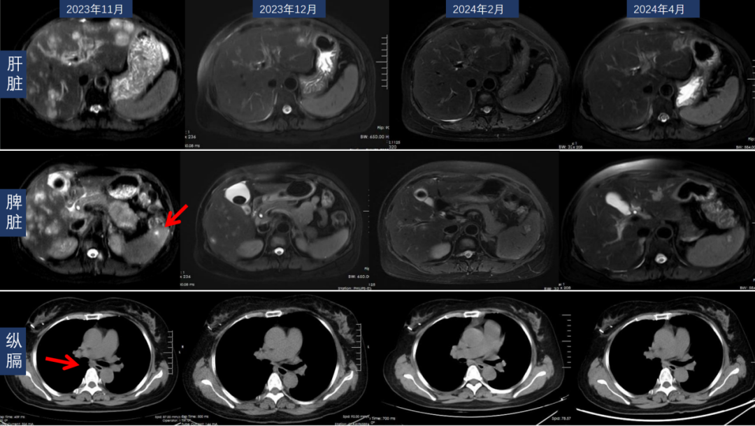 目前(截至2024年5月)患者已完成8个周期的戈沙妥珠单抗治疗。2023年12月、2024年2月及4月复查CT及MR如下图所示,肝、脾病灶和纵隔淋巴结、小脑转移病灶均有退缩、缓解。